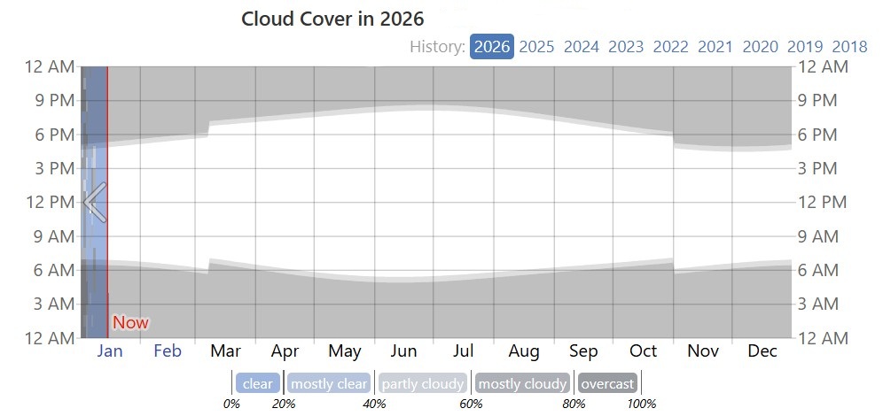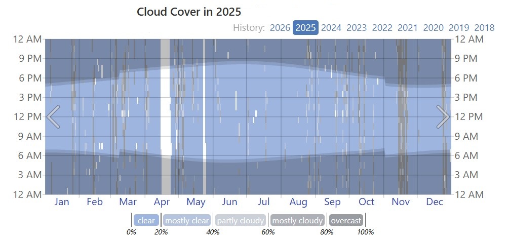 We enjoy around 300 clear nights per year — take a look at the cloud-cover records from 2024 and early 2025: